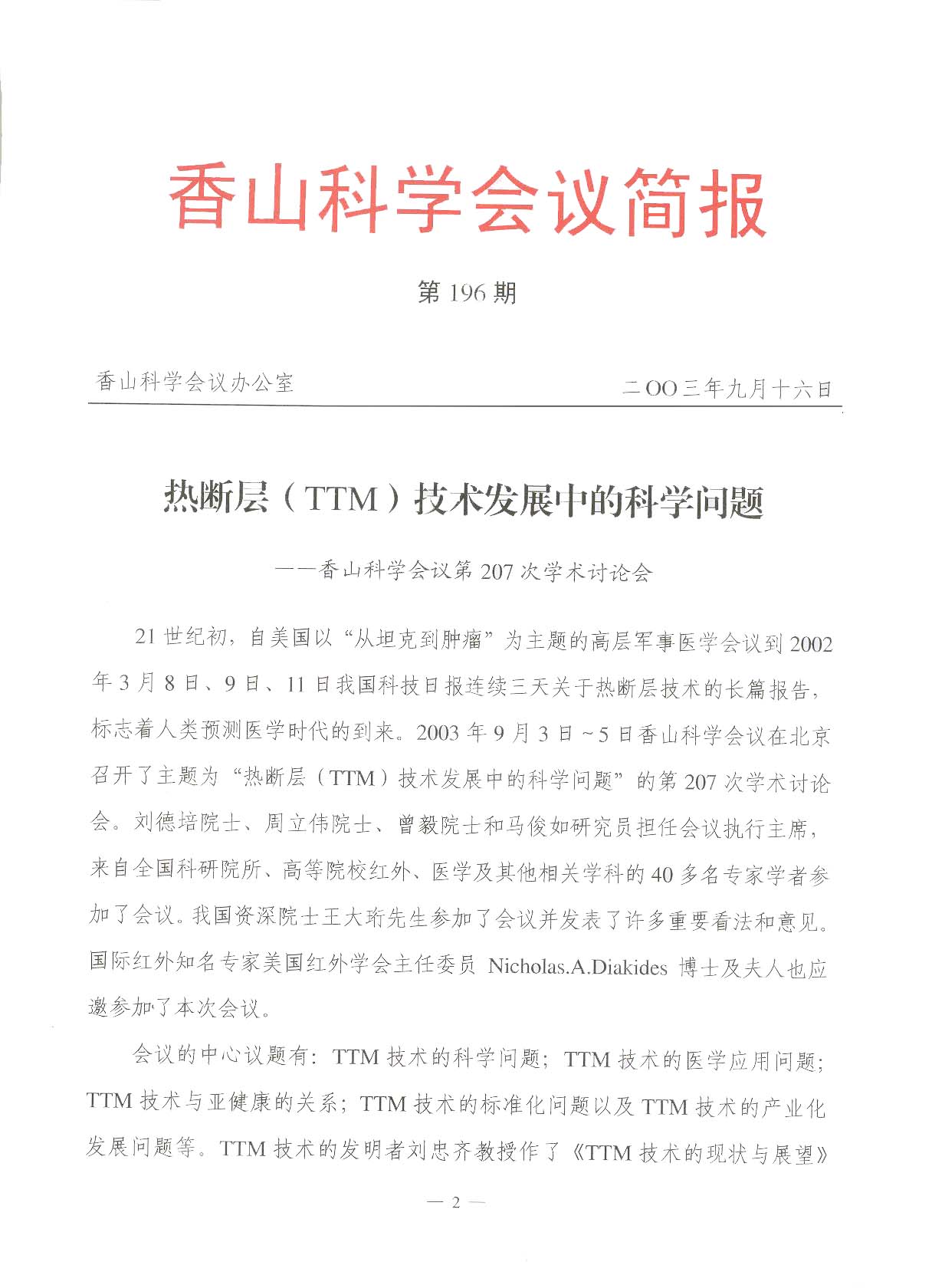2003年9月香山科學會議發布香山科學會議簡報(第196期)熱斷層(TTM)技術發展中的科學問題