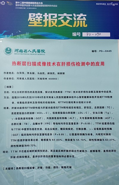 大會壁報展示了河南省人民醫院的《熱斷層掃描成像技術在肝損傷檢測中的應用》學術論文,文章對比分析了肝損傷的高危因素,探討應用熱斷層(TTM)技術在肝損傷診斷及篩查中的應用,結論表明TTM不僅能反應肝損傷狀態,而且能反應肝臟的綜合代謝能力,能夠客觀、直觀的評價肝臟的損傷情況,是評價肝損傷的重要指標和必要補充。